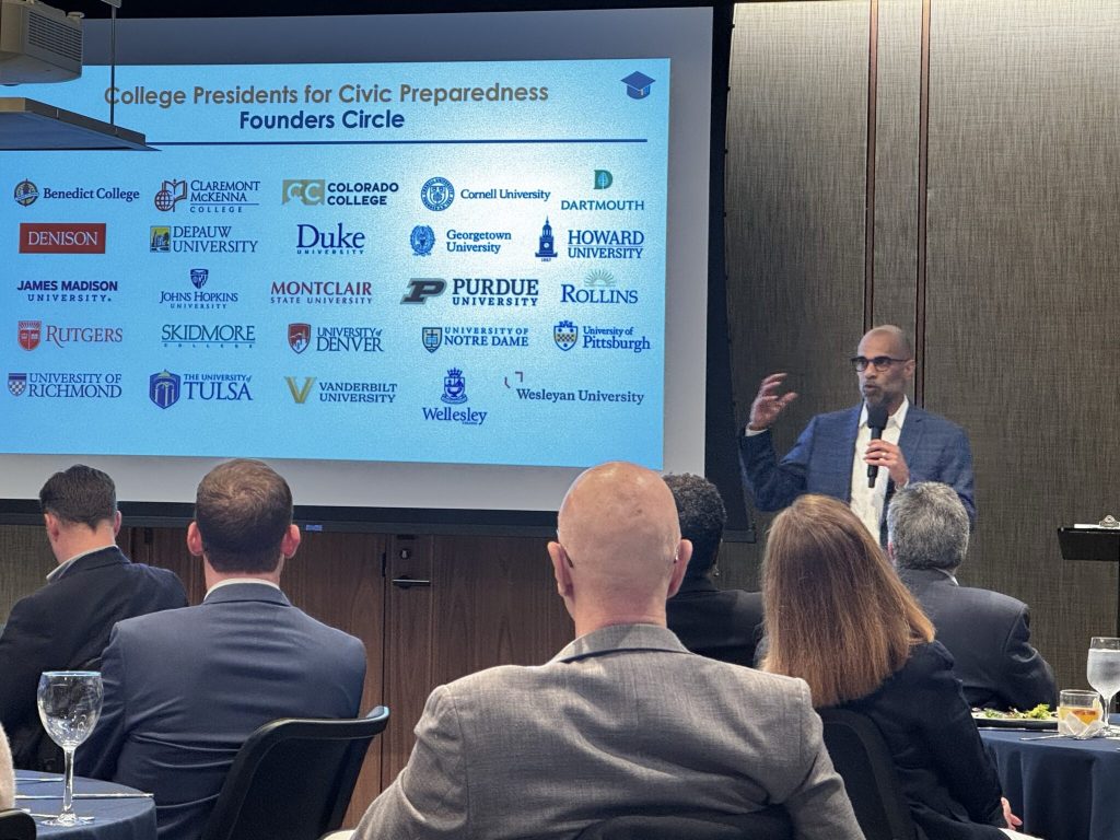 The gathering kicked off with a conversation between College Presidents for Civic Preparedness members Georgetown University President John J. DeGioia and Claremont McKenna College President Hiram Chodosh. Their discussion touched on the connection between civic education and mental health and the essential need for higher education to civically prepare the population given its responsibility as a public good.