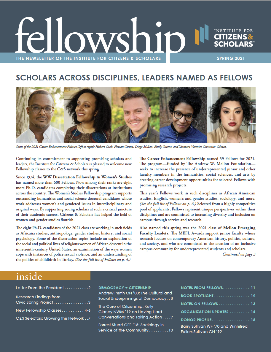 The spring 2021 issue of Fellowship, the newsletter of the Institute for Citizens & Scholars, includes recent Fellowship class announcements, profiles of Fellows researching democracy, a look into the selection process for annual Fellowship classes, and more.
